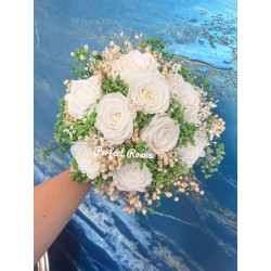 Buchet mireasa realizat din trandafiri naturali criogenati alaturi de floarea miresei criogenata.