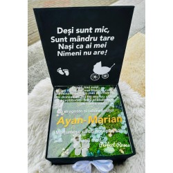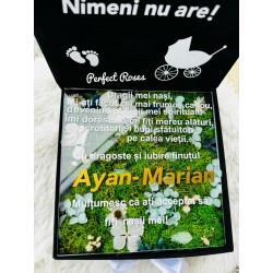 Cutie nași decorata cu flori criogenate, cu plăcută plexiglas personalizata cu mesajul dorit .Produsul se realizeaza doar pe comanda si in limita stocului disponibil de flori si materiale.