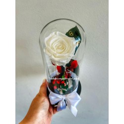 Trandafir natural criogenat alb, in cupola de sticla, 20 cm înălțime. Se poate personaliza după preferințe.